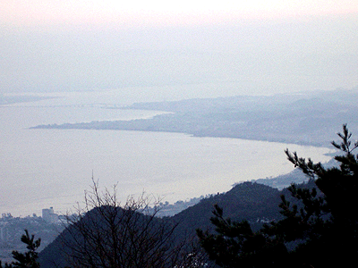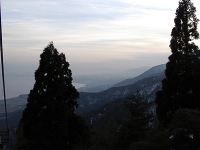 | 下山リフトの楽しみは、暮れなずむ比良山系の眺望とびわ湖の遠景です。右奥の大津の方へ向かって帰ります。 |