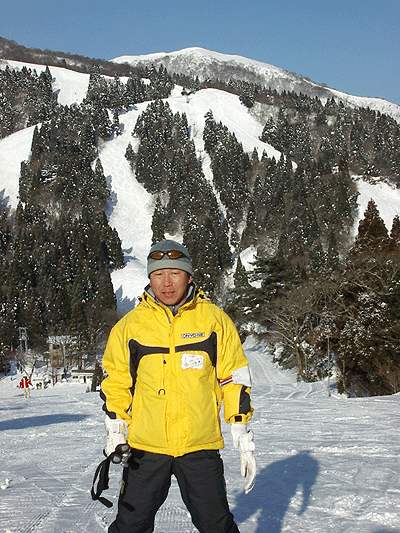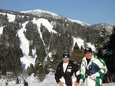 | 快晴の朝一ゲレンデで、村田指導員と検定の打合わせ。競技部の黒服が私です |