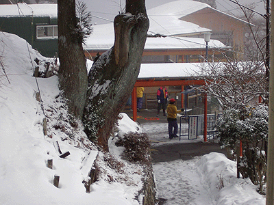 比良ロッジ裏からゲレンデへは、ここでスキーを着けて1分ほど下っていきます。まさに行き楽帰り苦! |